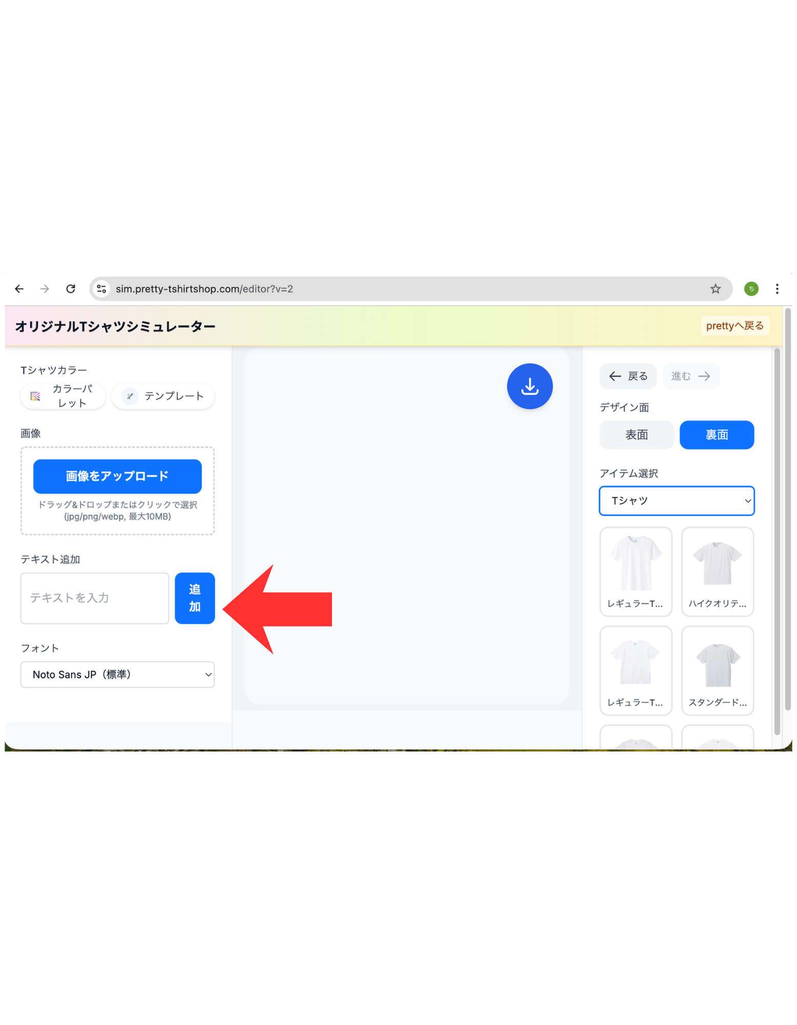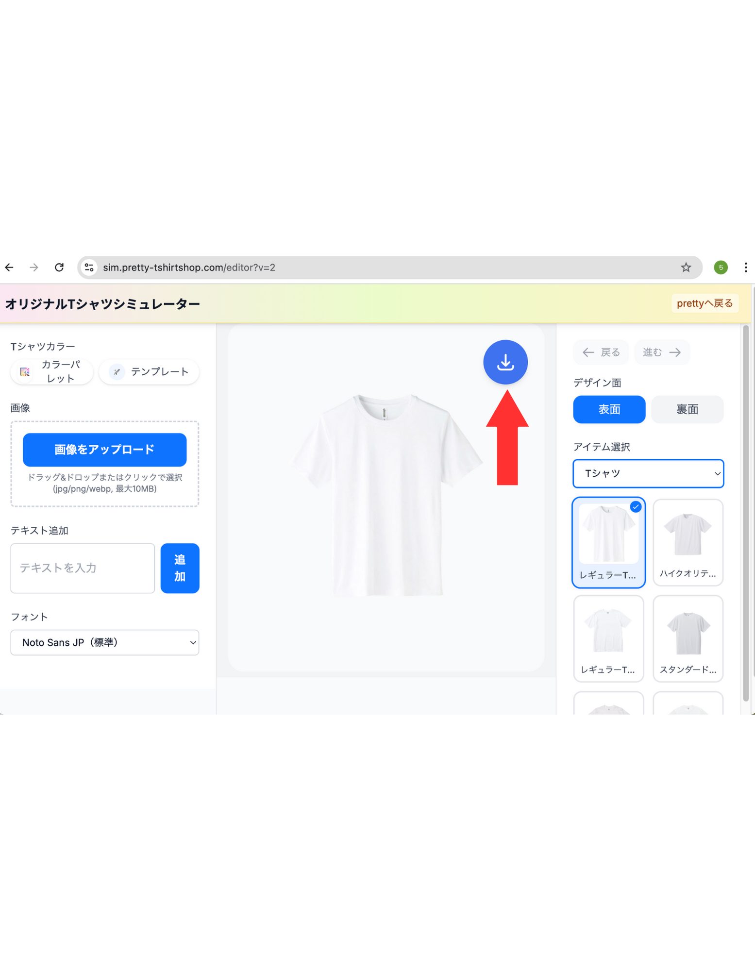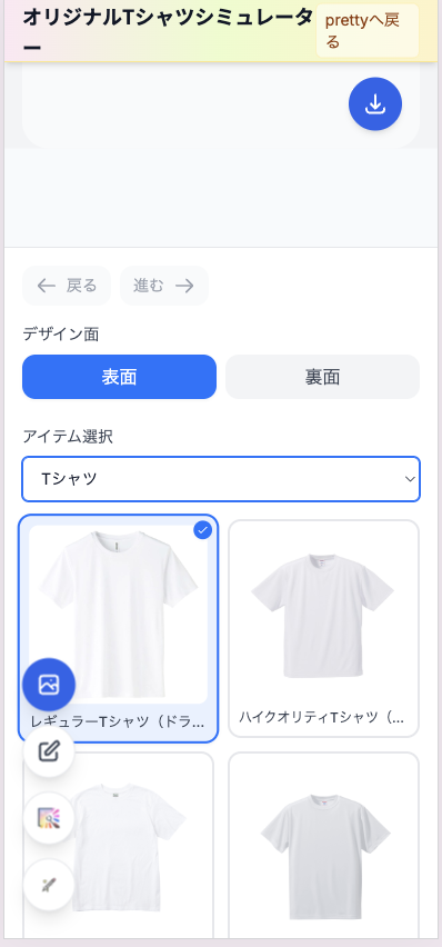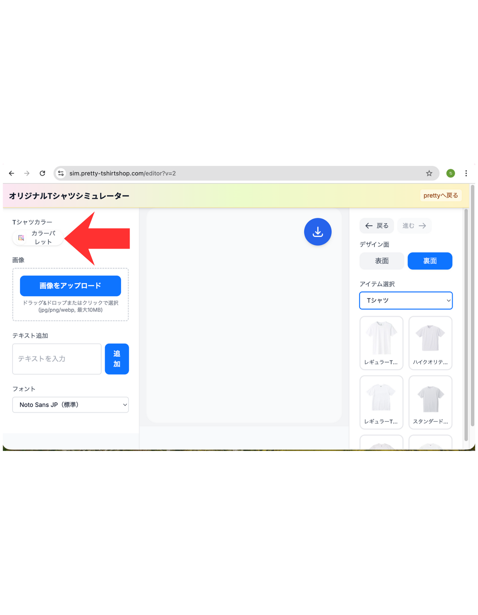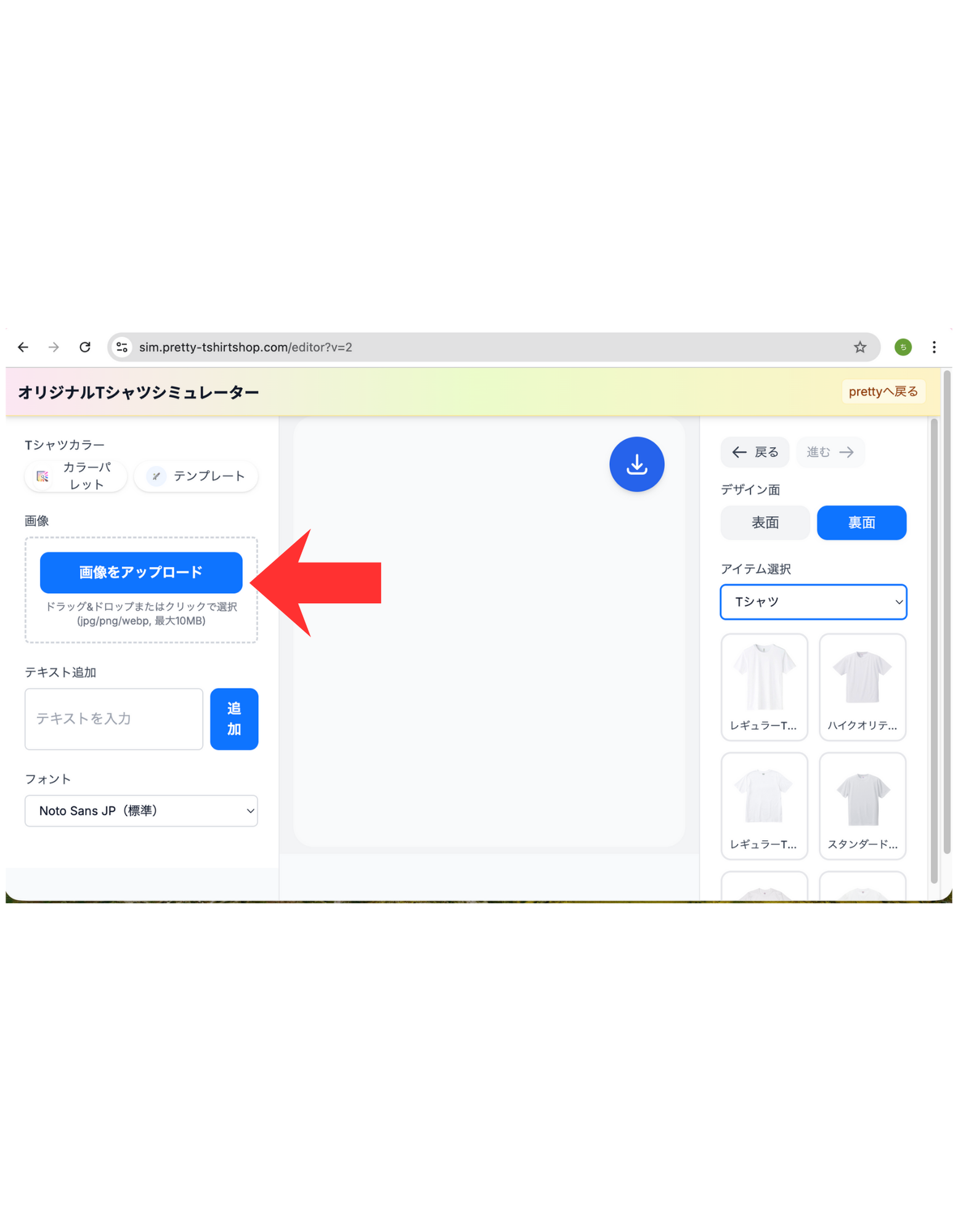 ヘッダーの「デザインシミュレーター」からシミュレーターを開きます。別タブで sim.pretty-tshirtshop.com のシミュレーターが起動する仕様です。