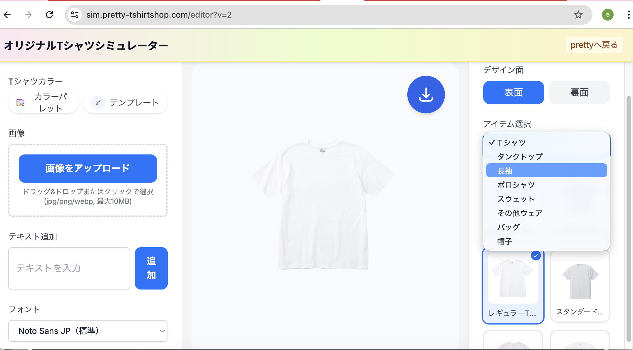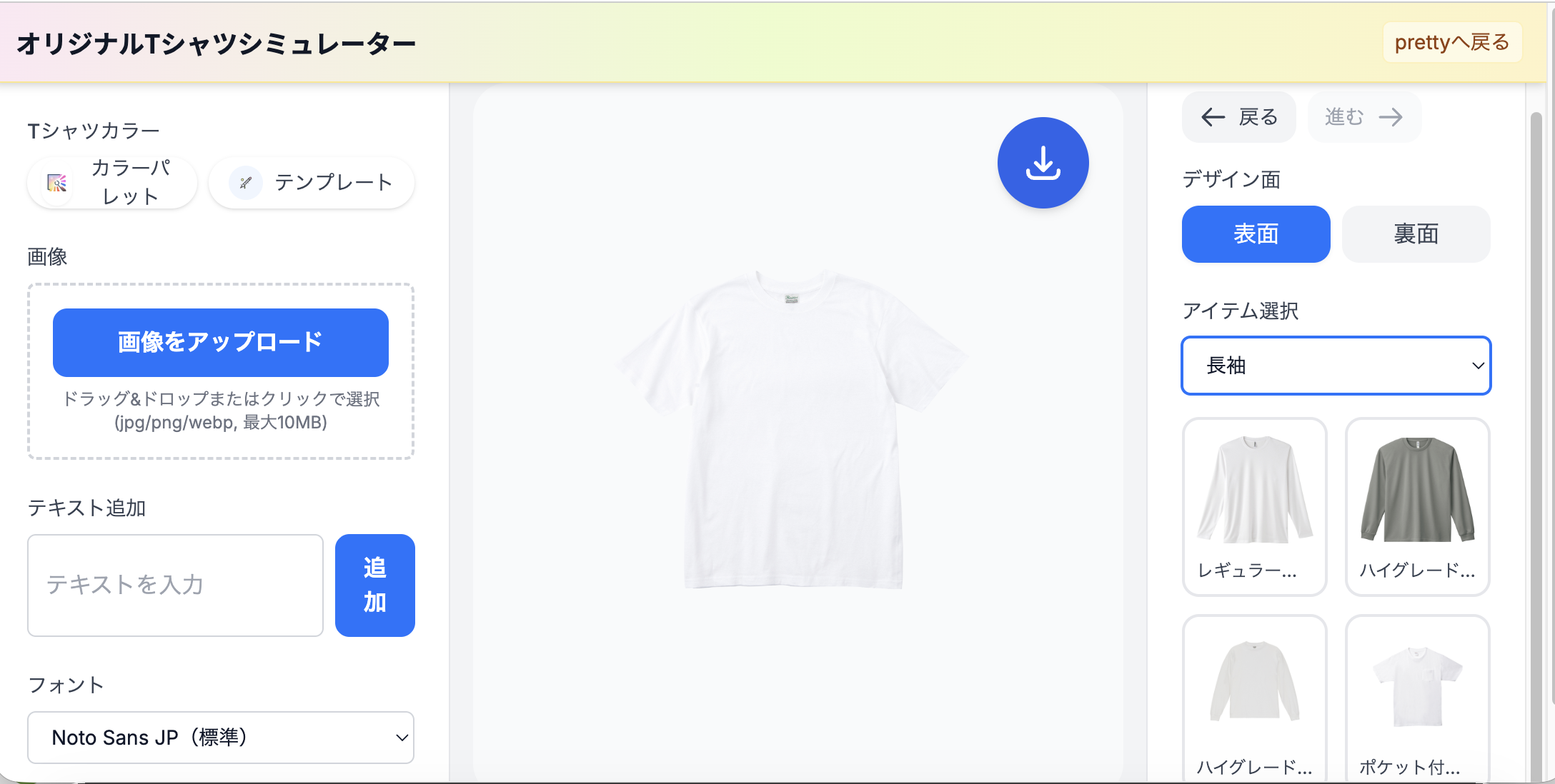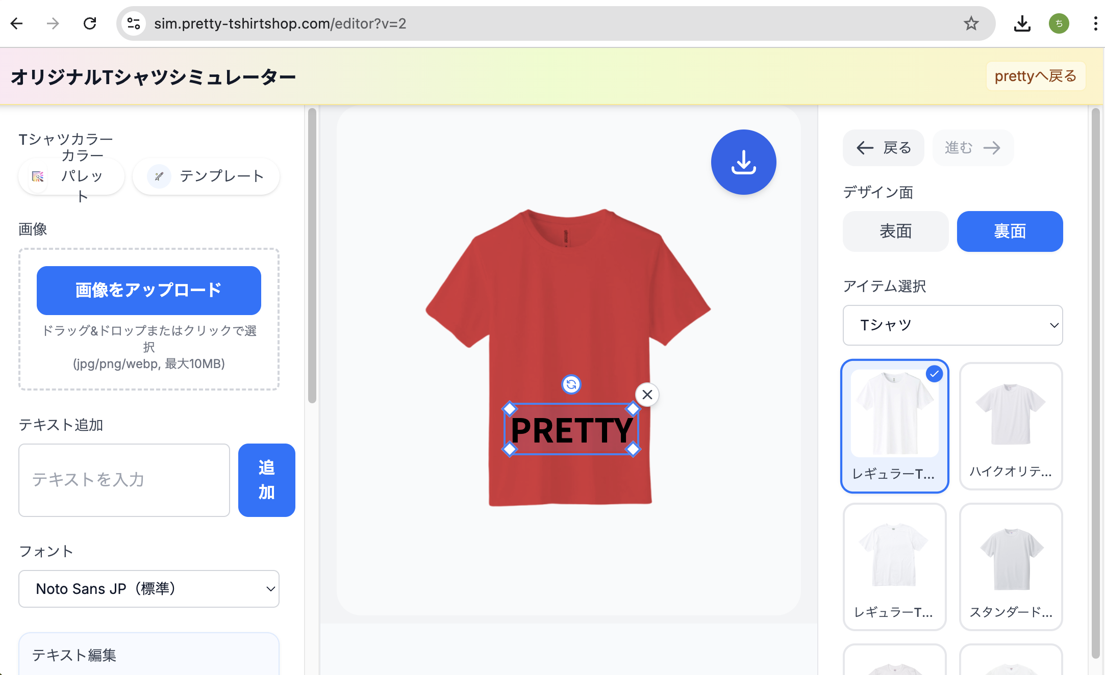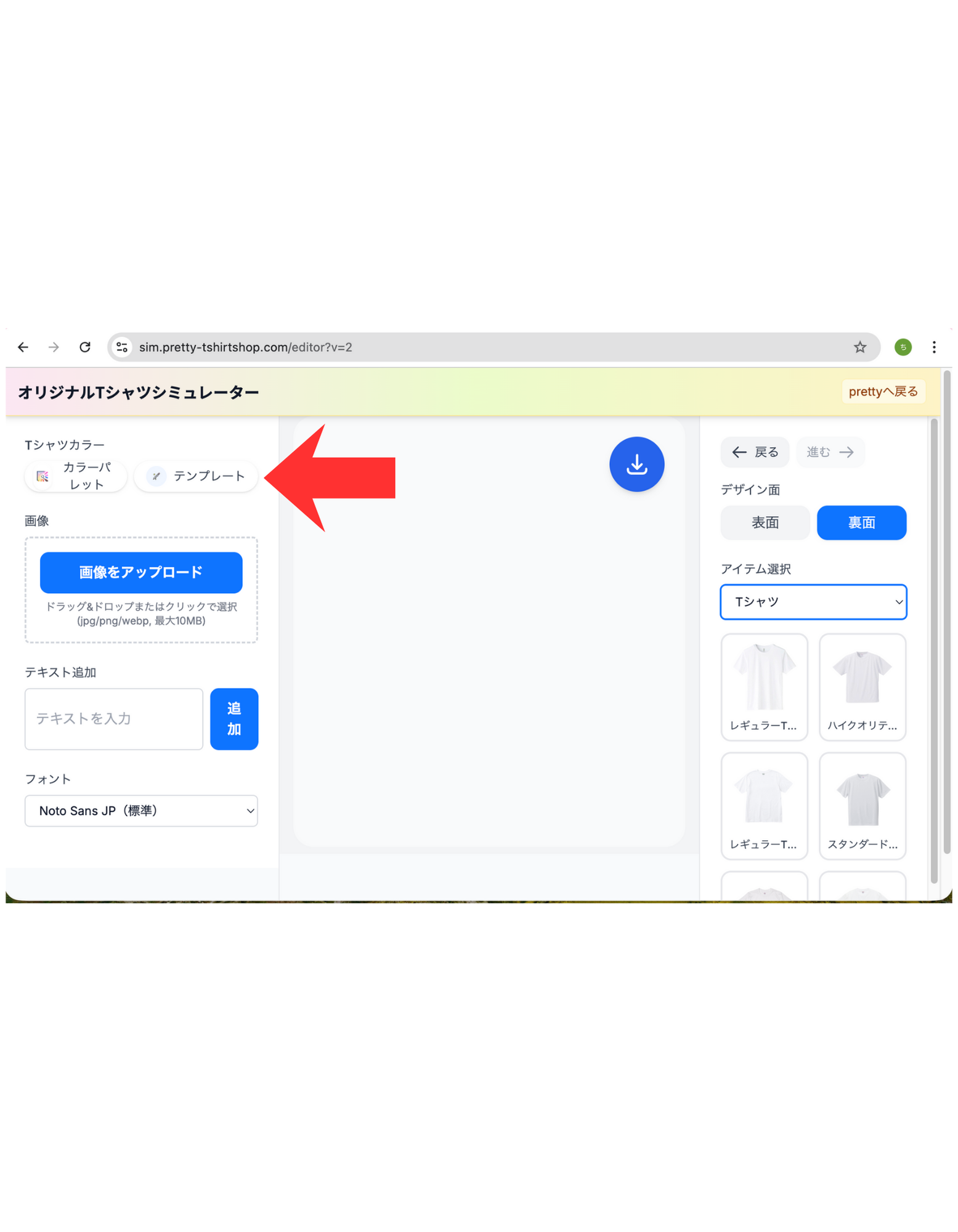 ヘッダーの「デザインシミュレーター」からシミュレーターを開きます。別タブで sim.pretty-tshirtshop.com のシミュレーターが起動する仕様です。