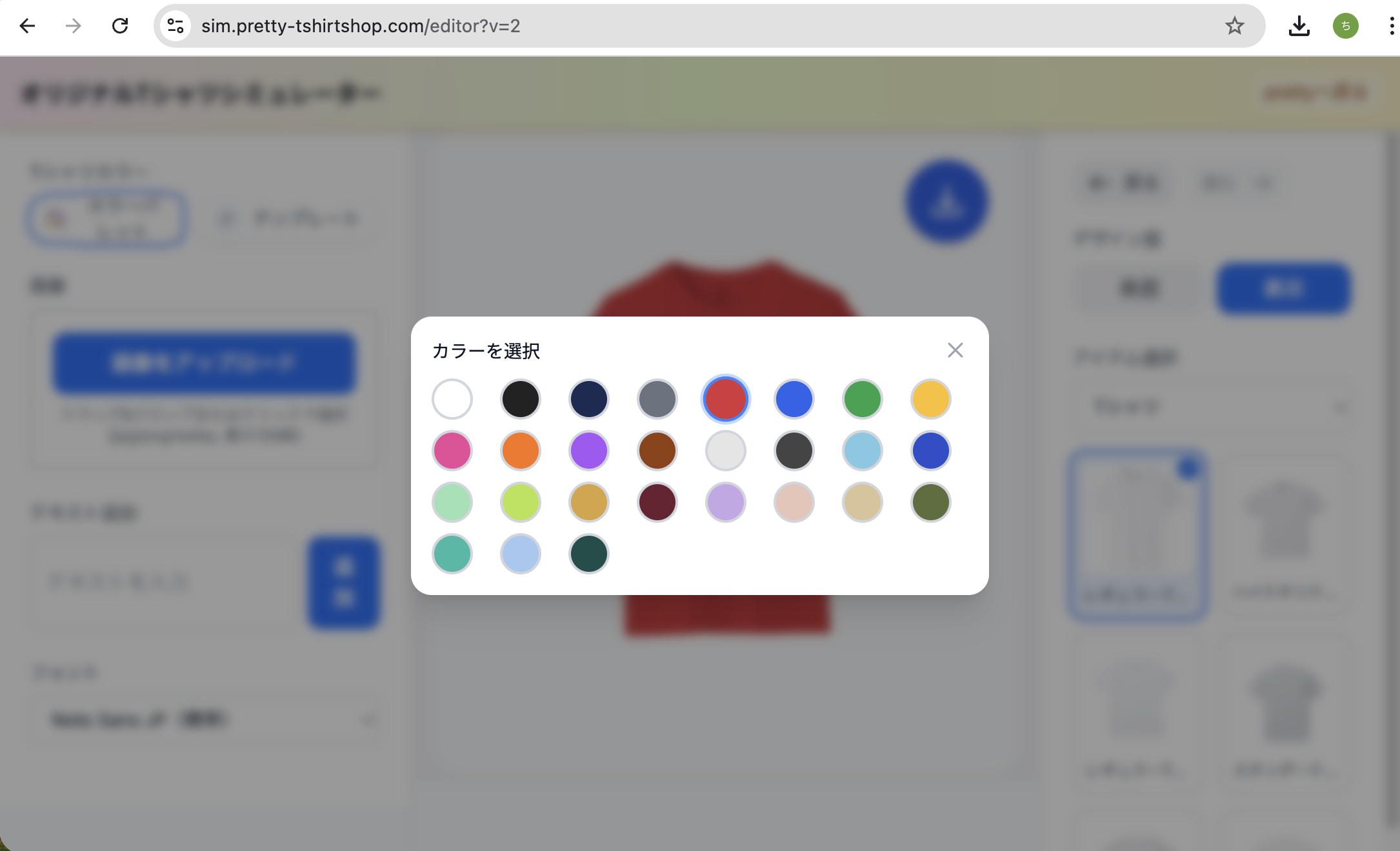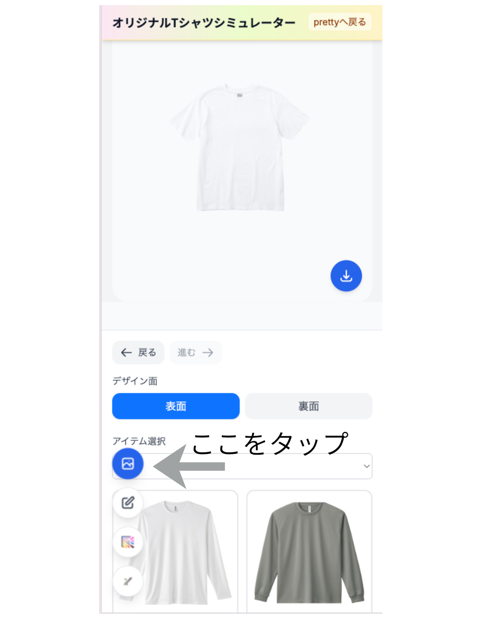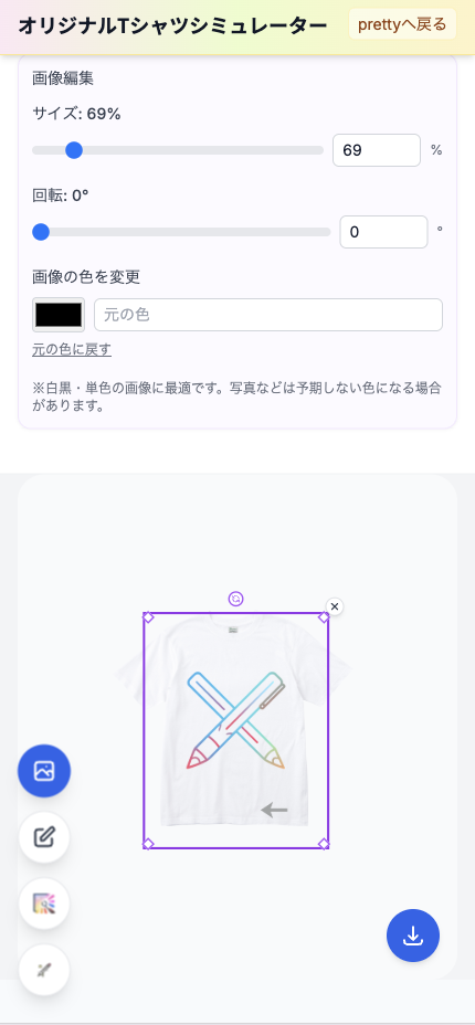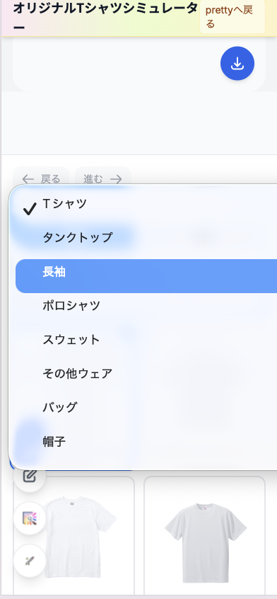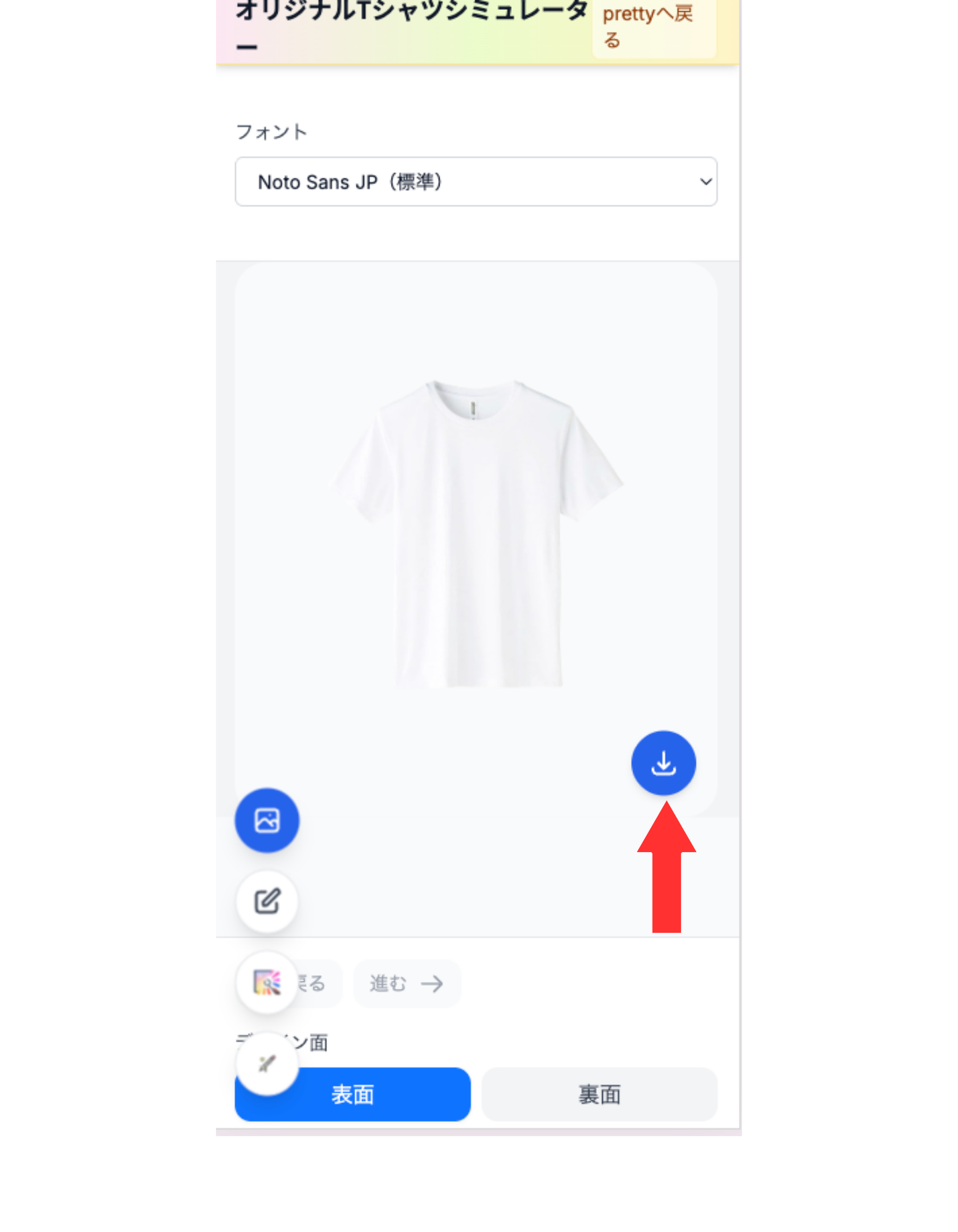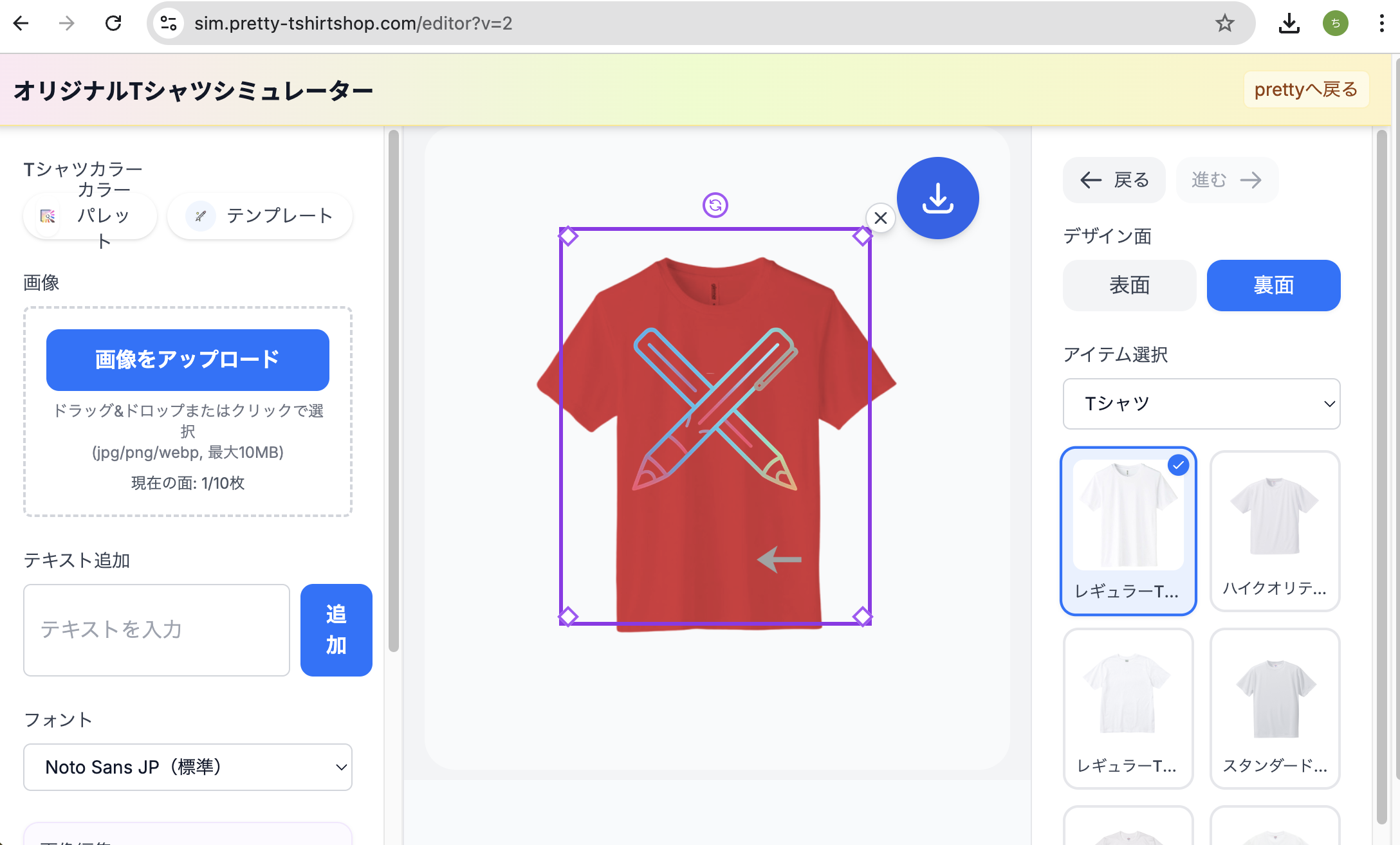 ヘッダーの「デザインシミュレーター」からシミュレーターを開きます。別タブで sim.pretty-tshirtshop.com のシミュレーターが起動する仕様です。