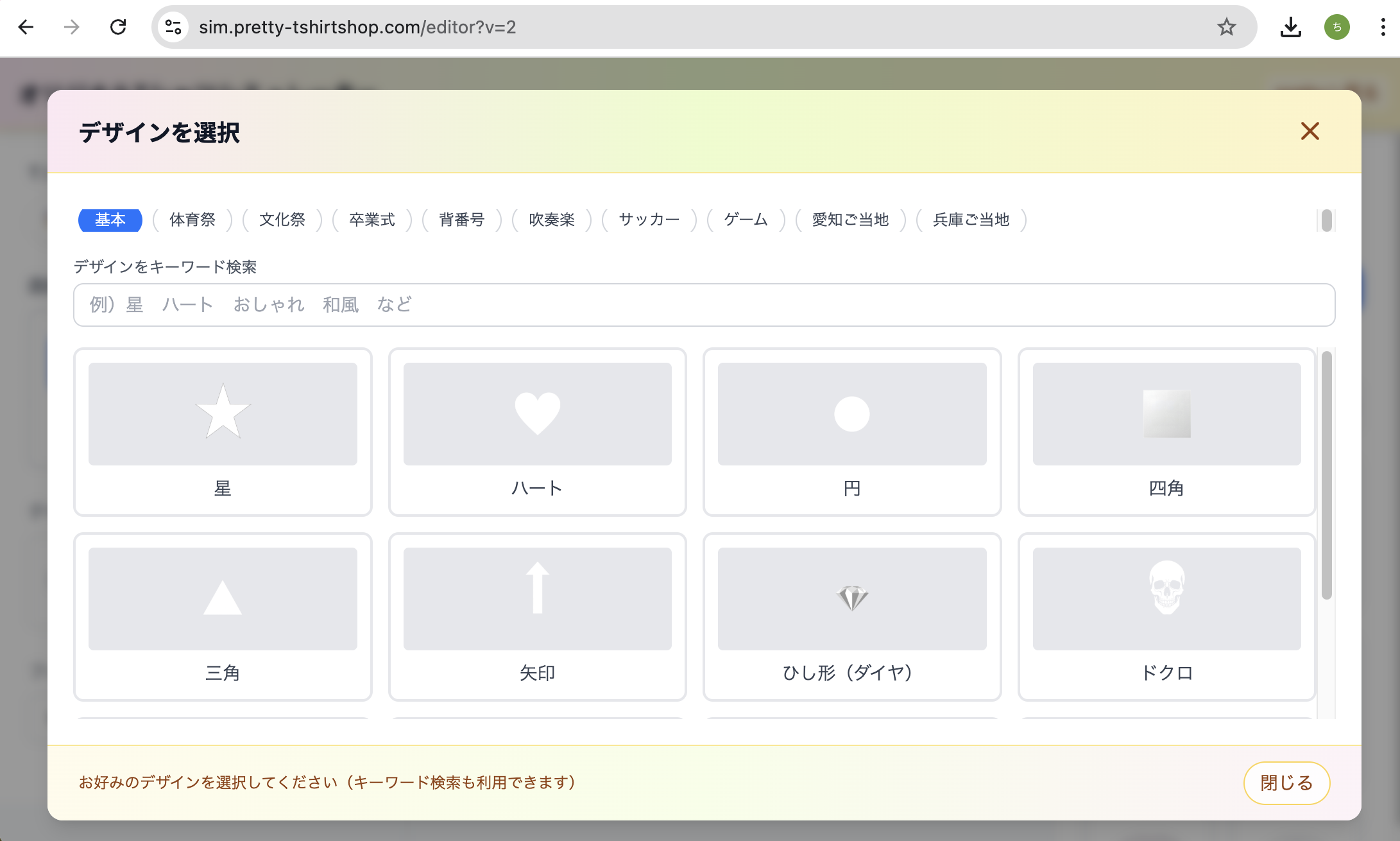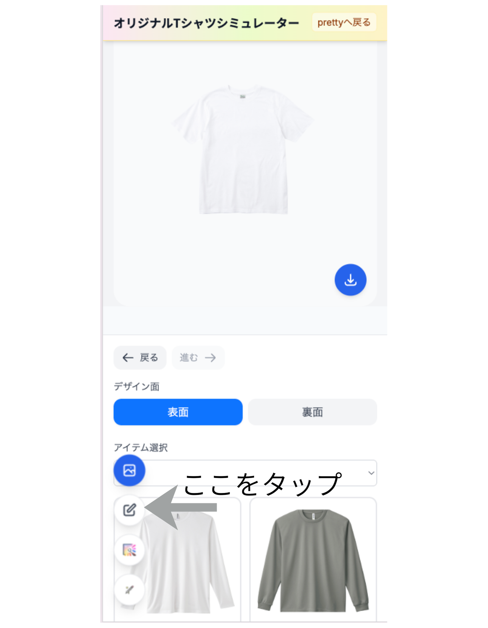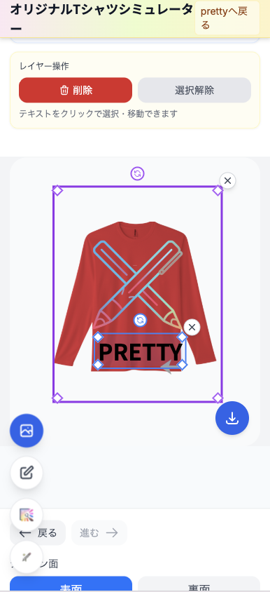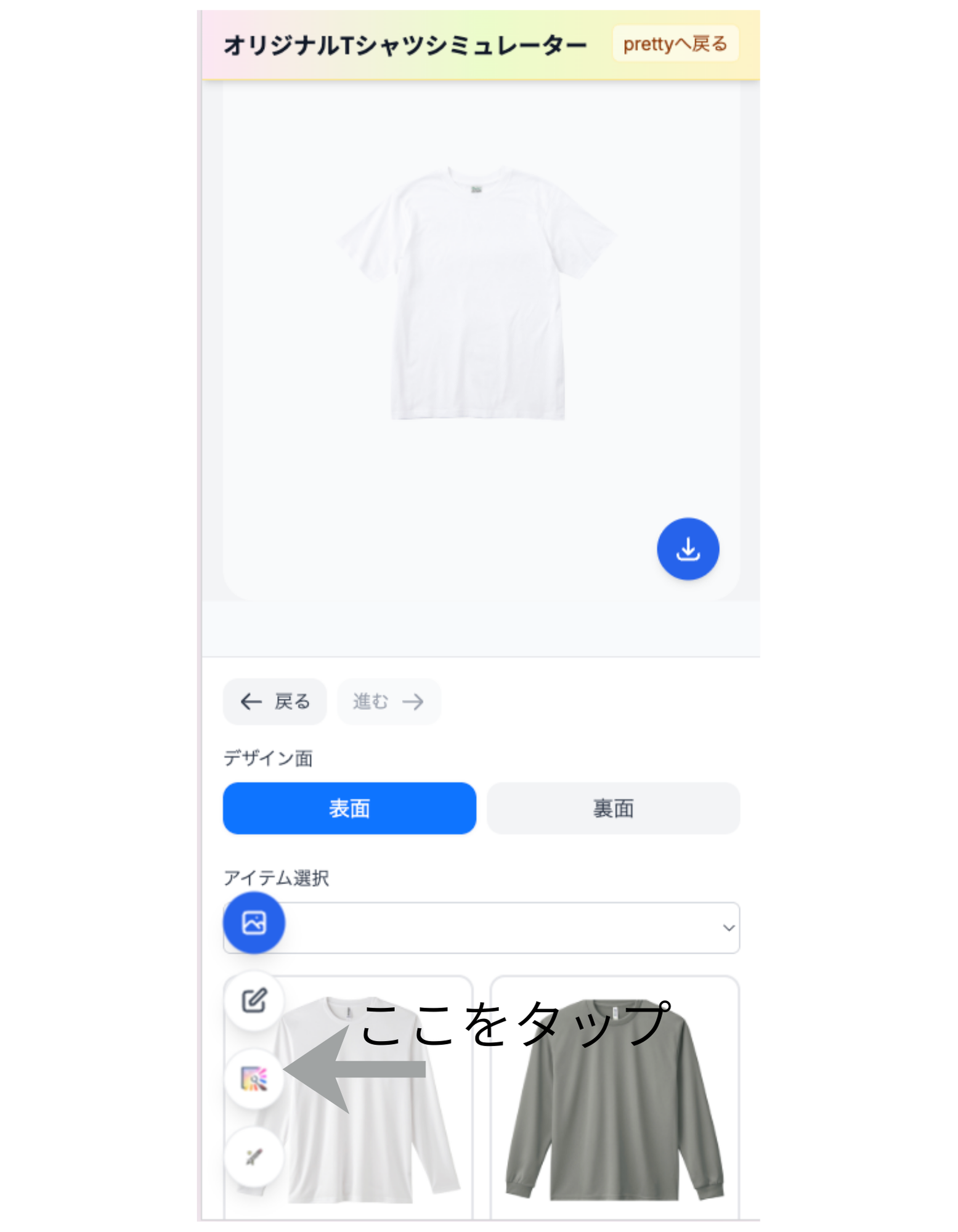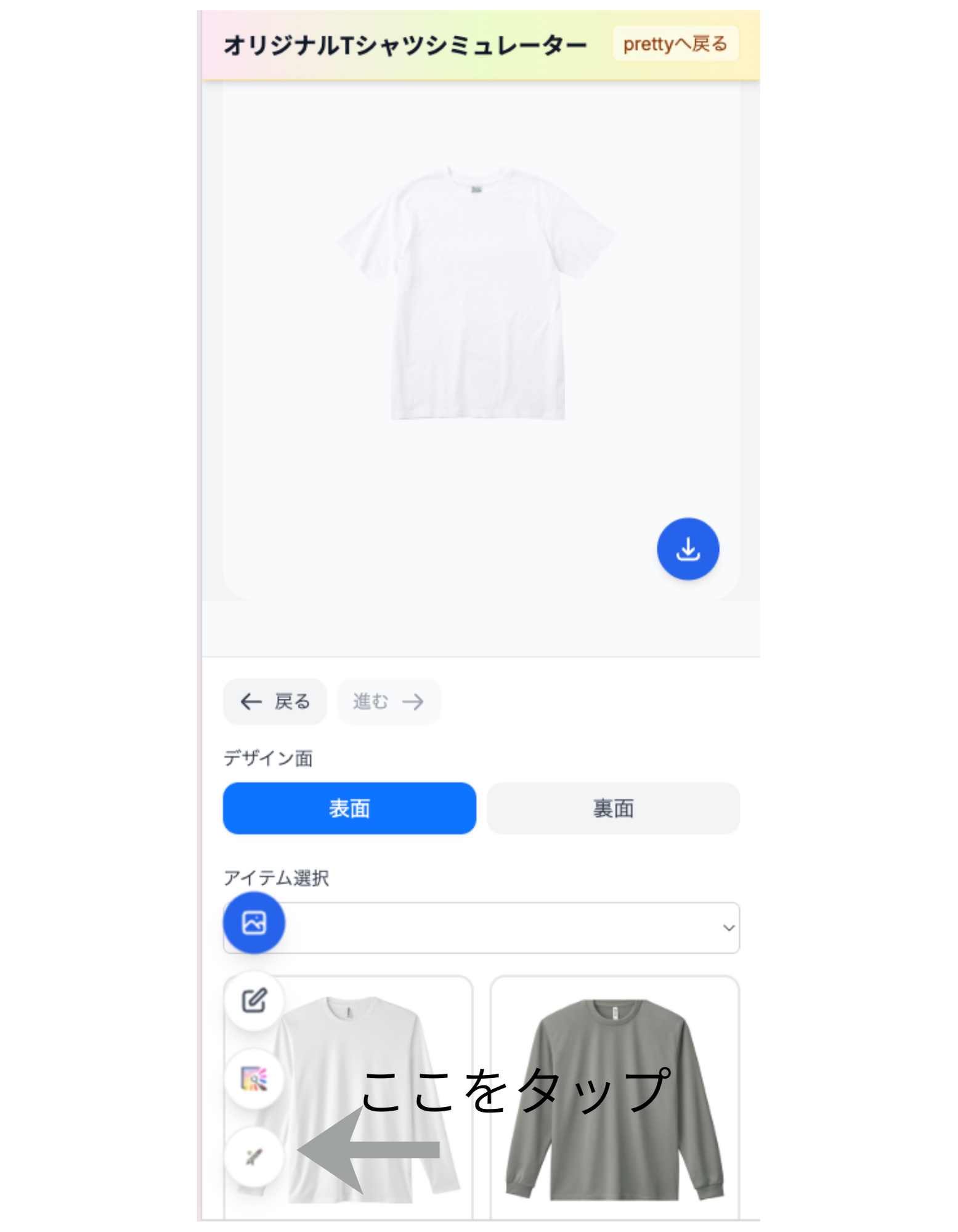 ヘッダーの「デザインシミュレーター」からシミュレーターを開きます。別タブで sim.pretty-tshirtshop.com のシミュレーターが起動する仕様です。